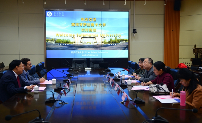 陳軍斌副校長對何塞·米格爾先生一行來訪表示歡迎,并介紹了學(xué)校的發(fā)展歷史和基本情況。他談到,為滿足中石油、中石化等企業(yè)在海外開展業(yè)務(wù)的需求,我校從1997年就開展了西班牙語的培訓(xùn)工作。隨著中國改革開放的深入和“一帶一路”倡議的實(shí)施,大批中國石油石化企業(yè)在南美西班牙語國家拓展業(yè)務(wù),急需大量西班牙語人才。我校是中國西北地區(qū)唯一一所以石油石化為特色的高等學(xué)校,在我校成立薩拉曼卡大學(xué)西班牙語學(xué)院具有重要意義,可以培養(yǎng)既懂專業(yè)技術(shù)又通曉西班牙語的復(fù)合型人才,服務(wù)于國家經(jīng)濟(jì)發(fā)展的需要和“一帶一路”倡議需求。他希望兩校以此為平臺開展全方位的合作,不僅僅局限于語言培訓(xùn),還要積極開展西班牙語及西班牙文化的研究,提升我校與西班牙教育合作交流的水平。