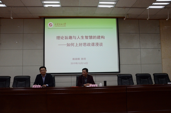 聘任儀式結(jié)束后,賴雄麟教授為馬院師生作了題為《理論旨趣與人生智慧的建構(gòu)——如何上好思政課漫談》的學(xué)術(shù)報(bào)告。他從我們?yōu)槭裁葱枰枷胝谓逃⑺枷胝谓逃男再|(zhì)、如何上好思想政治教育三個(gè)方面進(jìn)行了精彩地講解,并與參會師生進(jìn)行了互動交流。