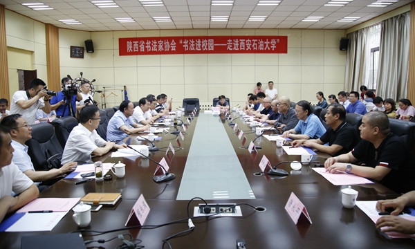 6月28日下午,陜西省書法家協(xié)會(huì)“書法進(jìn)校園——走進(jìn)西安石油大學(xué)”活動(dòng)在雁塔校區(qū)會(huì)議中心第一會(huì)議室舉辦。中國(guó)書法家協(xié)會(huì)理事、陜西省書法家協(xié)會(huì)主席陳建貢一行13人來(lái)我校與師生進(jìn)行了交流座談。我校校領(lǐng)導(dǎo),相關(guān)部門和學(xué)院負(fù)責(zé)人,校書法協(xié)會(huì)教師代表、學(xué)生代表以及多家媒體記者參加了活動(dòng)。