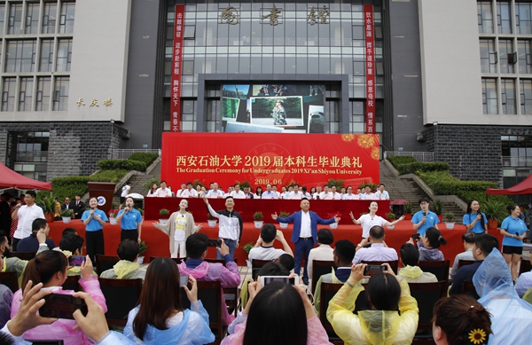 2019屆本科生畢業(yè)典禮在音樂系師生的“快閃”表演中拉開帷幕。音樂系師生在現(xiàn)場演唱了《老師我想你》《我為祖國獻(xiàn)石油》《我和我的祖國》三首歌曲,既表達(dá)了對恩師栽培的感恩之情,又體現(xiàn)了我校的石油石化特色,還蘊(yùn)含了慶祝新中國成立70周年的意義。