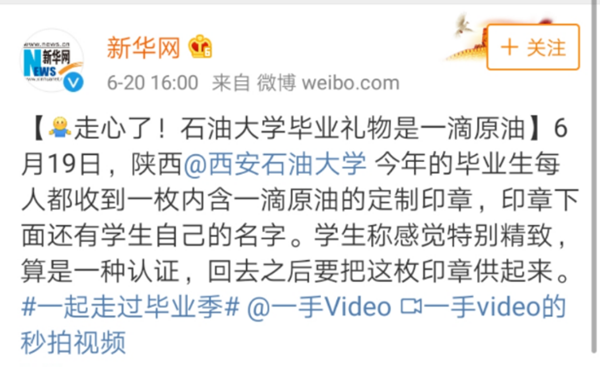 [校園文化]我校畢業(yè)禮物“一滴油印章”網(wǎng)絡(luò)閱讀量1.8億多