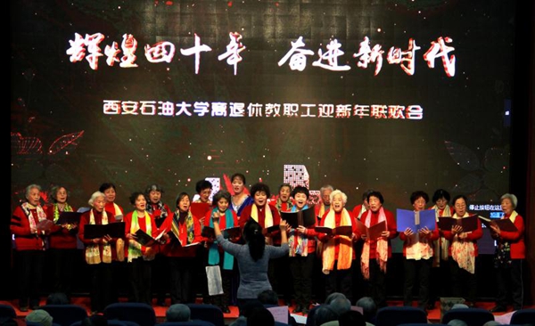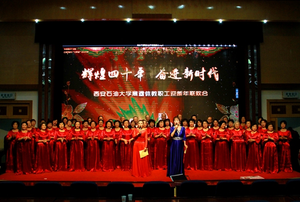 之后,老年大學(xué)的學(xué)員們與部分在職和離退休教職工為大家?guī)砹司实奈乃嚬?jié)目。聯(lián)歡會在開場舞《春天的芭蕾》中拉開了帷幕。老年大學(xué)女子合唱隊(duì)帶來的女聲小合唱《西安之夜》《浪花,海的頌歌》,合唱團(tuán)男生小合唱《一切獻(xiàn)給黨》《天路》,廣場舞分會帶來的舞蹈《藏舞串燒》,舞蹈協(xié)會帶來的戲曲古典舞《梨花頌》,葫蘆絲樂團(tuán)的聯(lián)奏《讓我聽懂你的語言》《阿哥阿妹不分離》等節(jié)目,充分展示了老年大學(xué)的教學(xué)成果和老同志熱愛生活的精神面貌。崔巍老師表演的電吹管獨(dú)奏《梨花又開放》《戰(zhàn)士為國守安詳》,高燕云、王宏順等老同志帶來的詩朗誦《祝酒歌》,展示了離退休教職工的多才多藝。老年大學(xué)合唱團(tuán)50多名團(tuán)員演唱的《牽手》,唱出了老同志們同甘共苦、相濡以沫的幸福,是對“執(zhí)子之手,與子偕老”的最好闡釋。大家在一片歡歌笑語聲中共同喜迎2019年的到來。