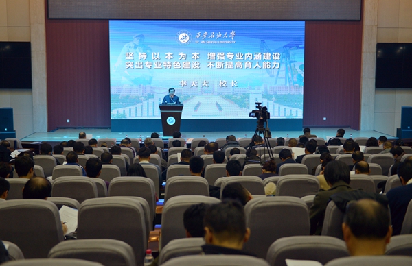 李天太校長作了題為《堅持以本為本,增強專業(yè)內(nèi)涵建設,突出專業(yè)特色建設,不斷提高育人能力》的報告。他首先從“人才培養(yǎng)體系進一步完善”“專業(yè)內(nèi)涵建設成效顯著”“教育教學改革扎實推進”“教學管理更加規(guī)范”“生源和人才培養(yǎng)質(zhì)量不斷提高”五個方面,對兩年來的本科教學工作進行了回顧。
