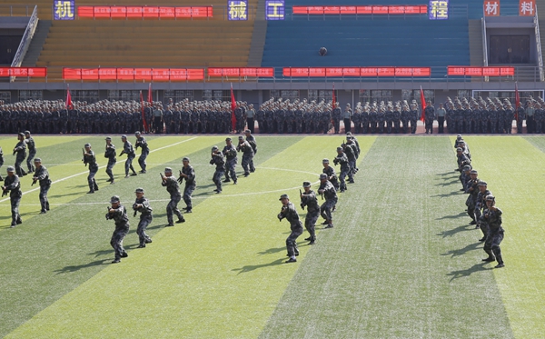 開(kāi)學(xué)典禮暨軍訓(xùn)匯報(bào)會(huì)在激昂的國(guó)歌聲中拉開(kāi)了序幕。伴隨著嘹亮的口號(hào),2018級(jí)新生們?cè)诟髟海ㄏ担┹o導(dǎo)員的帶領(lǐng)下邁著整齊矯健的步伐,精神飽滿地經(jīng)過(guò)主席臺(tái),接受校領(lǐng)導(dǎo)的檢閱。新生們還進(jìn)行了軍體拳、刺殺操、捕俘刀、旗語(yǔ)指揮等科目的表演。