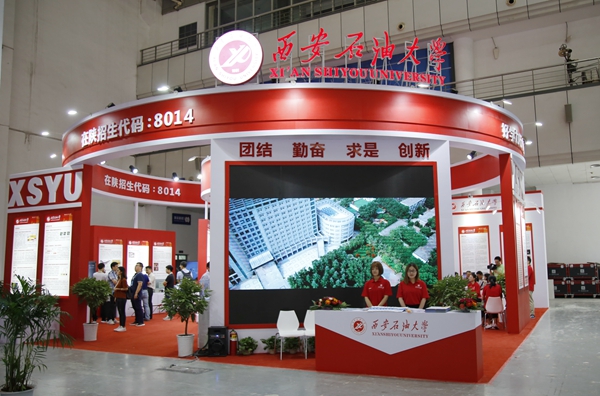 我校展區(qū)位于曲江國(guó)際會(huì)展中心核心展區(qū)A館,共有37項(xiàng)科研成果、15項(xiàng)研究生創(chuàng)新成果參展。展臺(tái)設(shè)計(jì)采用彩色圖文展板、科研成果實(shí)物展品、LED顯示、宣傳彩頁(yè)等多種形式,全方位展示了我校文化建設(shè)成果、教育扶貧成果、“互聯(lián)網(wǎng)+”大學(xué)生創(chuàng)新創(chuàng)業(yè)成果、科技成果及研究生創(chuàng)新成果,并著重突出了石油石化特色。為做好參展工作,由教務(wù)處牽頭,科技處、研究生院及相關(guān)職能處室通力合作、積極準(zhǔn)備,按時(shí)提交資料,確保各項(xiàng)成果順利展出。各院(系)教師代表、招生辦公室工作人員、學(xué)生志愿者經(jīng)過認(rèn)真地培訓(xùn)學(xué)習(xí),在展會(huì)上為廣大家長(zhǎng)、學(xué)生提供了完善細(xì)致的信息咨詢服務(wù)。