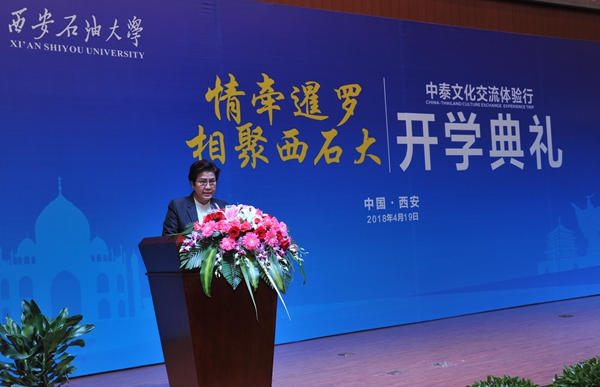 4月19日上午,我校在鄠邑校區(qū)弘石報告廳隆重舉行“情牽暹羅?相聚西石大——中泰文化交流體驗行”項目開學典禮。泰國薩拉武力府教育廳廳長維拉彭·德才、泰國教育部第二教育區(qū)主任拉蒂瑪·帕尼查弩芭、泰國教育部特殊教育局局長蘇達·素嫵,陜西省教育廳副廳長趙昶葆、我校校長屈展出席開學典禮。泰國中學校長代表團一行17人、參加體驗行活動的172名泰國師生以及我校百余名人文學院師生參加了系列活動。副校長陳軍斌主持儀式。