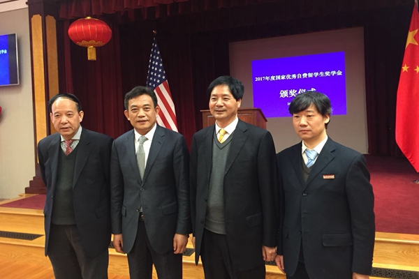 省教育廳副廳長王紫貴(左二)、賽云秀書記(左一)等參加2017年度國家優(yōu)秀自費(fèi)留學(xué)生獎學(xué)金頒獎儀式