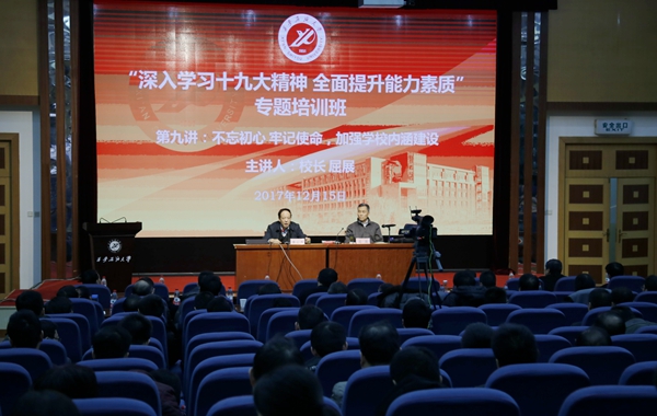 12月15日下午,我?!吧钊雽W習黨的十九大精神,全面提升能力素質”處級干部專題培訓班第九講、第十講在雁塔校區(qū)會議中心學術報告廳舉辦,校黨委書記賽云秀、校長屈展分別作專題輔導報告。校領導、全校處科級干部、教工黨支部書記、系主任、教研室(實驗室)主任、大學生思想政治輔導員參加報告會。