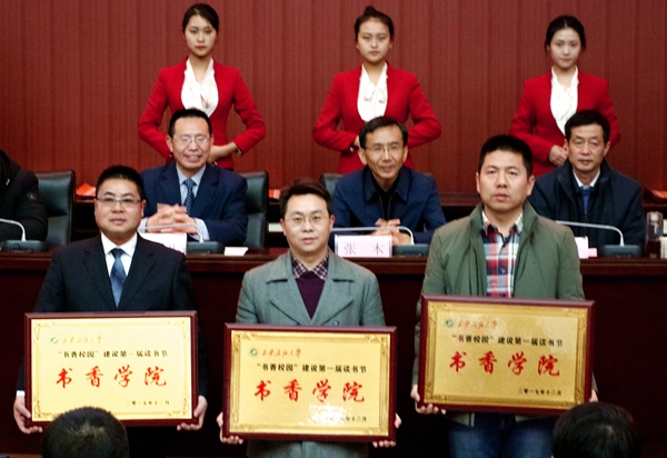 12月13日下午,我?!皶阈@”建設(shè)第一屆讀書節(jié)總結(jié)表彰暨第二屆讀書節(jié)開幕式在邑校區(qū)弘石報告廳舉行。校黨委副書記張木、陜西省作家協(xié)會副主席李國平、陜西省新聞出版廣電局公共服務(wù)處副處長閆林海、陜西嘉匯漢唐圖書發(fā)行有限責(zé)任公司副總經(jīng)理陳東出席大會。宣傳部、學(xué)生工作部、團(tuán)委、圖書館等部門負(fù)責(zé)人,各院系主管學(xué)生工作負(fù)責(zé)人,全體學(xué)生工作干部,學(xué)生代表共400余人參加了大會。大會由學(xué)生工作部部長王宏衛(wèi)主持。