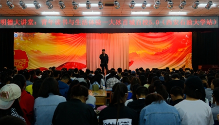 9月25日晚,由校團委主辦、理學(xué)院團委承辦的第五十期明德大講堂之《青年讀書與生活體驗》在鄠邑校區(qū)騰輝大學(xué)生活動中心舉辦。著名主持人、暢銷書作家大冰擔任主講,新校區(qū)四百余名學(xué)生聽取了講座。