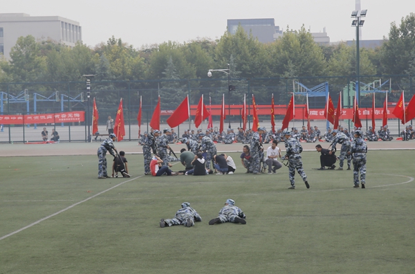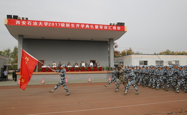 開學(xué)典禮暨軍訓(xùn)匯報(bào)會(huì)在激昂的國(guó)歌聲中拉開了序幕。伴隨著嘹亮的口號(hào),2017級(jí)新生們?cè)诟髟海ㄏ担┹o導(dǎo)員的帶領(lǐng)下邁著整齊矯健的步伐,精神飽滿地經(jīng)過主席臺(tái),接受校領(lǐng)導(dǎo)的檢閱。隨后,新生們還進(jìn)行了擒敵拳方陣、武警舞步操方陣、匕首操方陣、舞旗擒敵配套方陣、戰(zhàn)術(shù)解救人質(zhì)演習(xí)、石油學(xué)子花樣隊(duì)形等科目的表演。