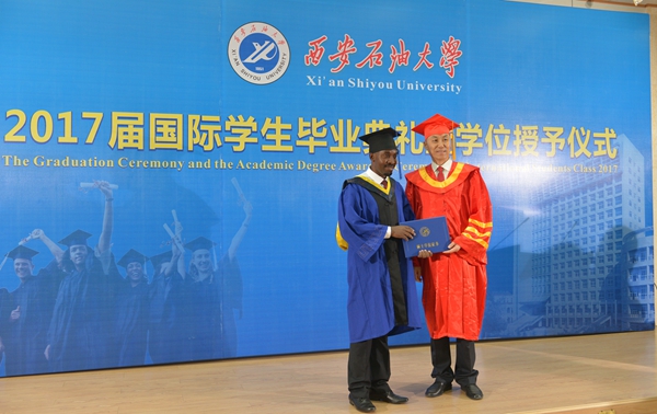 儀式上,教務(wù)處副處長(zhǎng)張君濤、研究生院副院長(zhǎng)屈文濤分別宣讀了獲得學(xué)士學(xué)位、碩士學(xué)位的國(guó)際學(xué)生名單。國(guó)際交流與合作處處長(zhǎng)張榮軍、國(guó)際教育學(xué)院(絲路能源學(xué)院)院長(zhǎng)董皓分別為2017屆優(yōu)秀國(guó)際學(xué)生畢業(yè)生、國(guó)際校友理事頒發(fā)了證書和聘書。