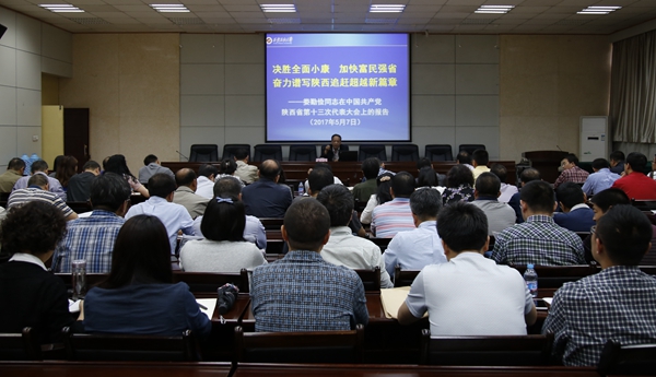 會上,省第十三次黨代會代表賽云秀書記組織學習了省委書記婁勤儉代表中共陜西省第十二屆委員會向大會作的《決勝全面小康,加快富民強省,奮力譜寫陜西追趕超越新篇章》的工作報告。報告共分四個部分:一、過去五年工作的基本總結(jié);二、陜西未來發(fā)展的根本遵循;三、努力推動陜西發(fā)展實現(xiàn)新的跨越;四、深入推進黨的建設新的偉大工程。賽書記重點就報告中涉及的教育方面工作深入解讀,并結(jié)合我校實際,對落小落實落細省黨代會精神提出了明確要求。