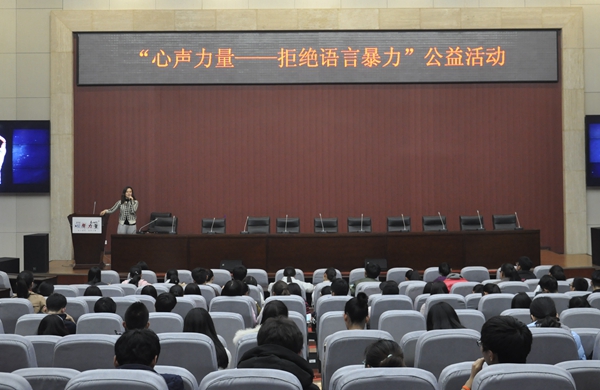 11月17日晚,由陜西廣播電視臺896汽車調(diào)頻《長安夜話》節(jié)目發(fā)起,團省委青少年權(quán)益維護中心、陜西省律師協(xié)會共同支持的“心聲力量——拒絕語言暴力”公益活動在我校新校區(qū)舉辦。知名主播曉輝、馬小路、馬大帥擔(dān)任主講嘉賓,此次活動由校團委承辦。