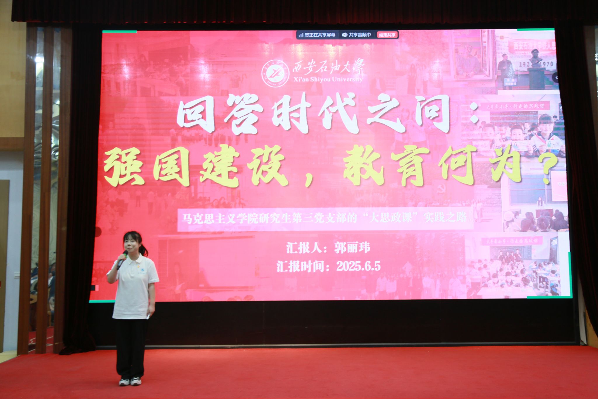 在十佳研究生黨員風(fēng)采展示中,石油工程學(xué)院博士研究生陳浩宇講述了以“融山匯?!敝聚`行能源報國初心,將九年志愿服務(wù)與六年黨務(wù)工作融入科研探索,發(fā)表8篇SCI論文和多項科研項目,以1150小時志愿服務(wù)踐行初心,以山海之志鑄就能源報國的新篇。經(jīng)濟管理學(xué)院碩士研究生姬祥飛講述了在西石大七年求學(xué)中,勤于實踐,漫漫求索,獲學(xué)生骨干、學(xué)術(shù)科研、學(xué)科競賽等多項成果,曾獲三次國家獎學(xué)金,榮獲“陜西好青年”,彰顯新時代青年擔(dān)當(dāng)?shù)墓适?。機械工程學(xué)院碩士研究生李紀新,以“紀實青春支教路,心繪未來新篇章”為主題分享了他的支教經(jīng)歷和感悟,展現(xiàn)了以青春之小我融入祖國之大我,在未來學(xué)術(shù)挑戰(zhàn)中奮勇向前的信心和決心。電子工程學(xué)院碩士研究生熊澤康以“小電路大擔(dān)當(dāng):一名工科黨員的能源報國路”為題,講述了以紅色信仰鑄就科研報國志,在團隊科研項目中實現(xiàn)國產(chǎn)化突破,抒發(fā)了石油學(xué)子以電路為刃破解能源困局,以青春擔(dān)當(dāng)鑄牢國家能源安全防線的青春志向。