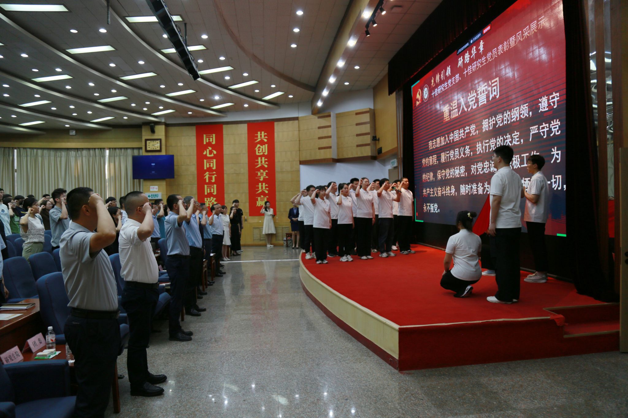 展示結(jié)束后,現(xiàn)場全體黨員在“雙十佳”研究生黨員的帶領(lǐng)下重溫入黨誓詞。大家舉起右拳,莊嚴宣誓,再一次用入黨誓詞洗滌心靈,激發(fā)為共產(chǎn)主義奮斗終生的昂揚精神。