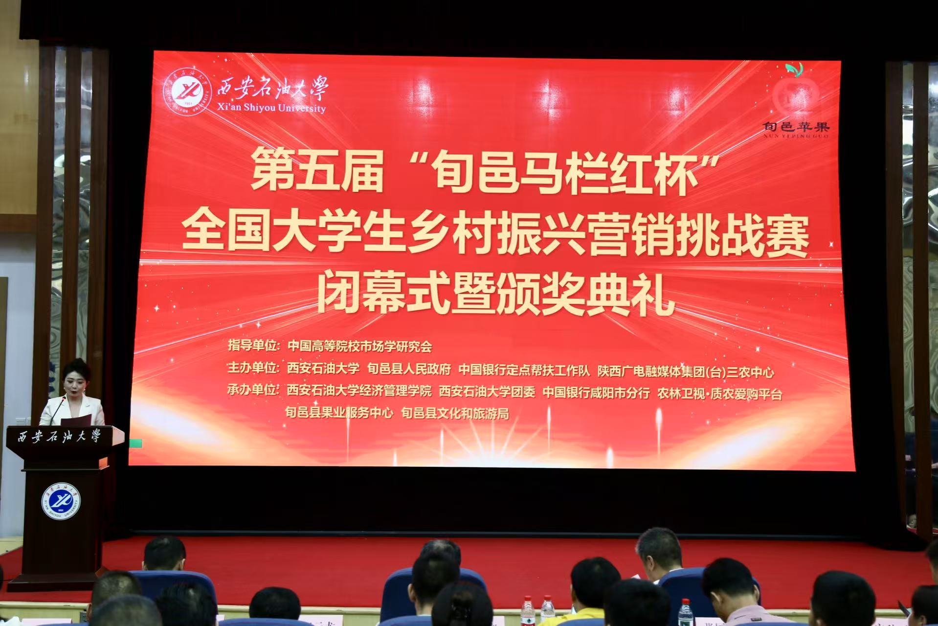 7月3日,第五屆“旬邑馬欄紅杯”全國大學(xué)生鄉(xiāng)村振興營銷挑戰(zhàn)賽閉幕式暨頒獎典禮在西安石油大學(xué)雁塔校區(qū)會議中心順利舉行。本屆賽事由西安石油大學(xué)、旬邑縣人民政府、陜西廣電融媒體集團(tuán)三農(nóng)中心等單位共同主辦,中國高等院校市場學(xué)研究會為指導(dǎo)單位。咸陽市副市長葉新階、副秘書長何有明、農(nóng)業(yè)農(nóng)村局副局長袁野,陜西省果業(yè)中心綜合處處長張東峰,旬邑縣委副書記、縣長陳永勝、副縣長譚震,陜西廣電融媒體集團(tuán)質(zhì)農(nóng)愛購平臺總經(jīng)理趙小飛,中國銀行咸陽分行行政事業(yè)部主任朱燕萍、陜西日報群眾新聞網(wǎng)副總經(jīng)理劉強,西安石油大學(xué)黨委副書記張木等出席閉幕式。參賽團(tuán)隊、企業(yè)負(fù)責(zé)人百余人到場參會。