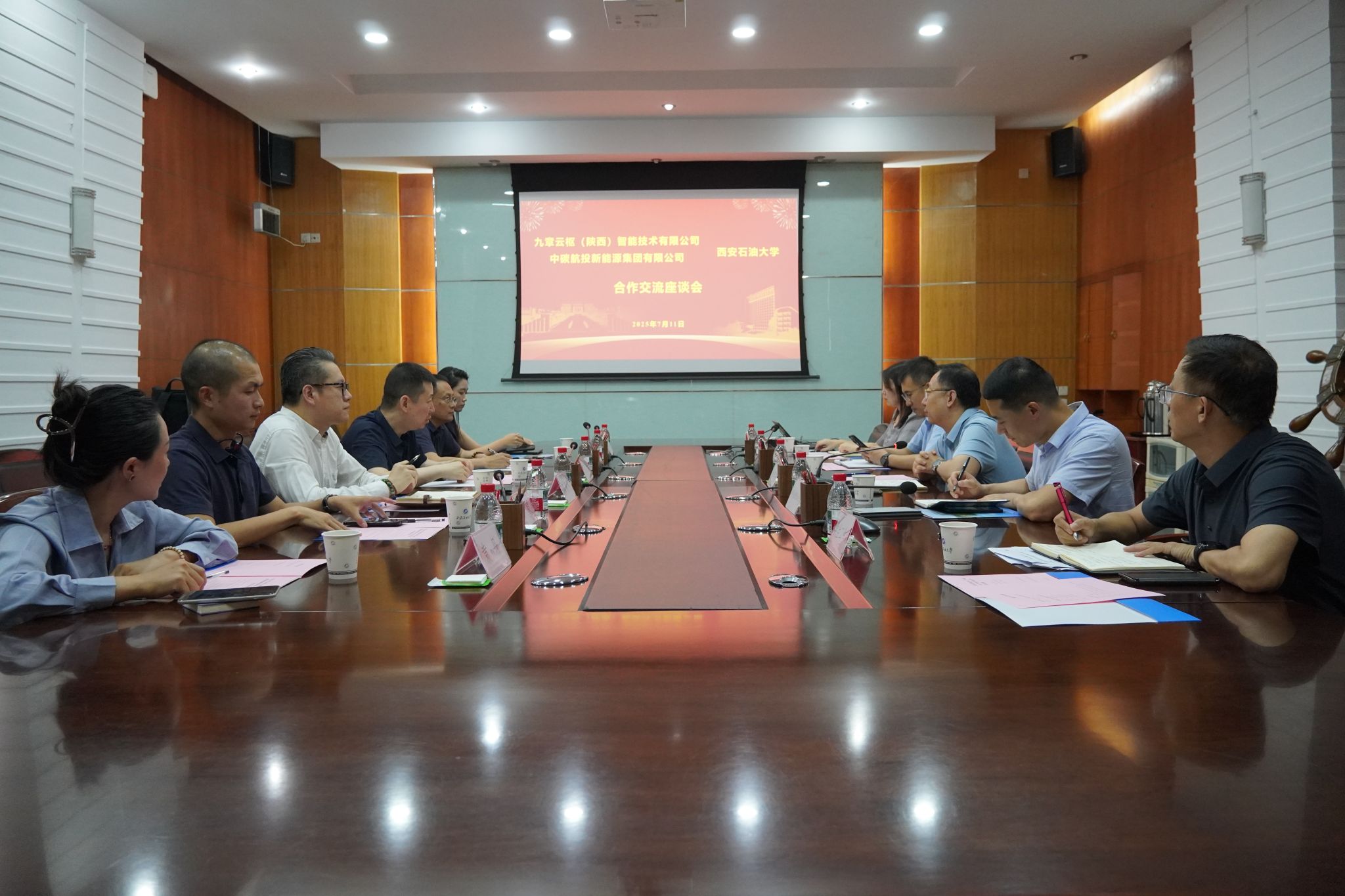 7月11日下午,我校與九章云樞(陜西)智能技術有限公司、中碳航投新能源集團有限公司開展合作交流座談會。九章云樞(陜西)智能技術有限公司董事長陳高科,中碳航投新能源集團有限公司副總經(jīng)理張戈,研究中心主任俞呂群,投資部副部長陳健,西北開發(fā)部袁丹、趙夢雨一行出席座談會。座談會由校黨委委員、副校長種宇宏主持。
