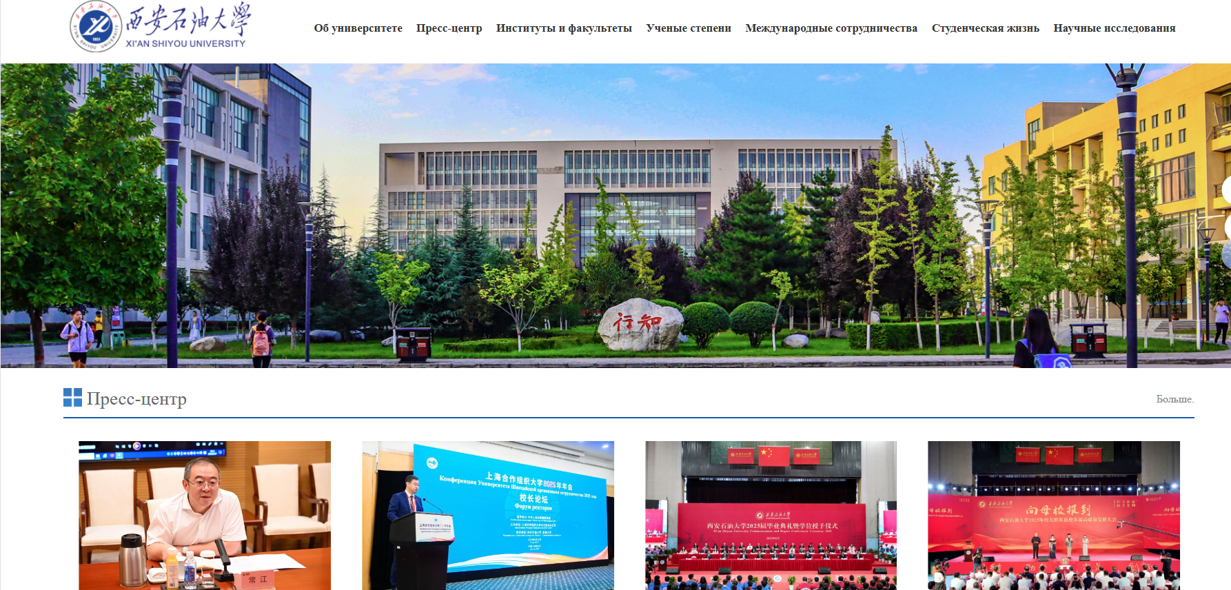 俄文主頁聚焦學(xué)校核心發(fā)展成果,開設(shè)學(xué)校概況(об университете)、新聞中心(Пресс-центр)、院系介紹(Институты и факультеты)、學(xué)術(shù)學(xué)位(Ученые степени)、國際合作(Международные сотрудничества)、校園生活(Студенческая жизнь)、科學(xué)研究(Научные исследования)等特色板塊,系統(tǒng)呈現(xiàn)學(xué)校在人才培養(yǎng)、科學(xué)研究、社會服務(wù)等方面的綜合實(shí)力,尤其突出國際化辦學(xué)的鮮明特色與豐碩成果,為俄語世界打開一扇了解西石大的全新窗口。