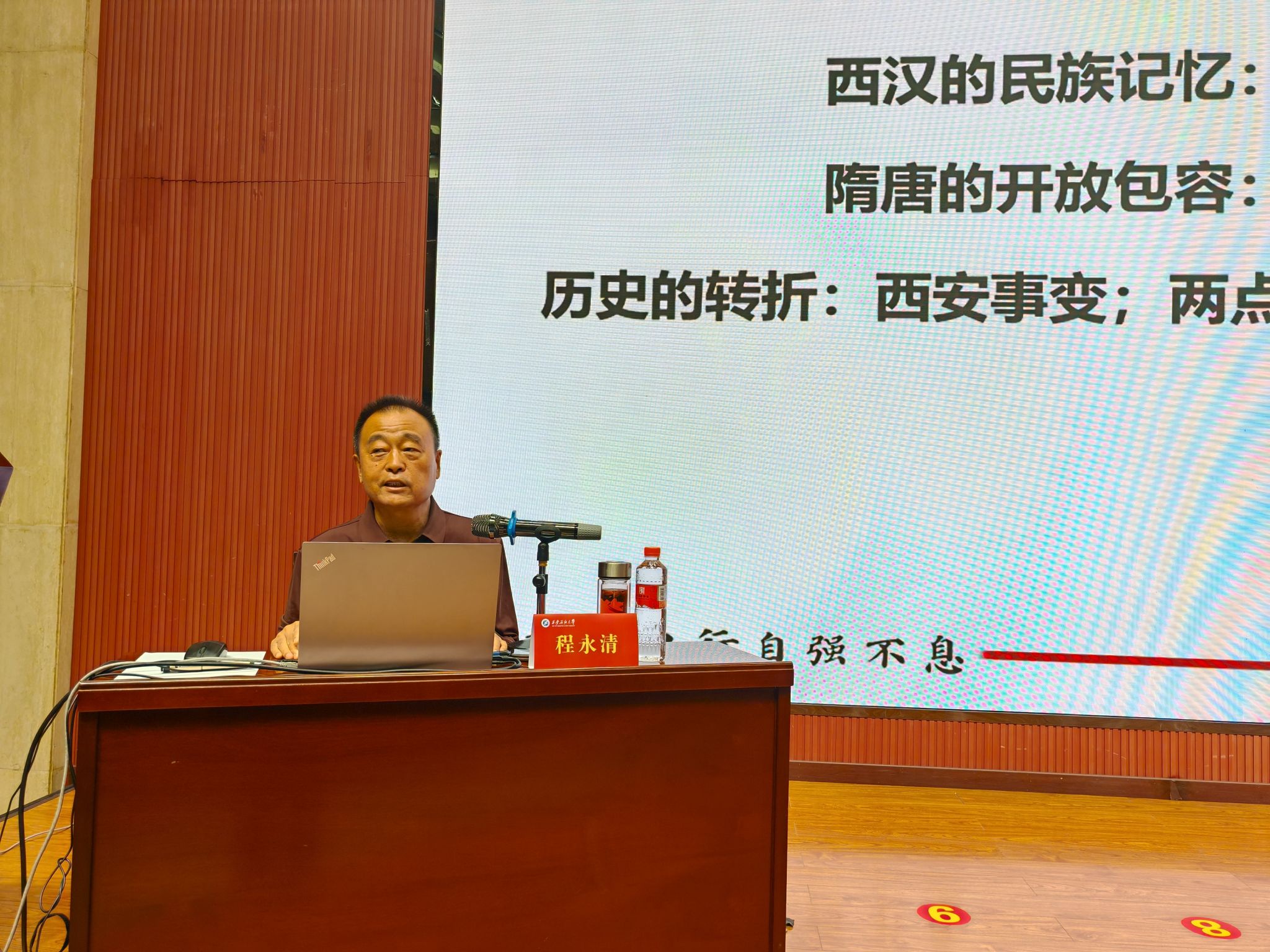 程永清圍繞“紅色血脈:學校成立的宏大歷史背景”“自強不息:艱難曲折的辦學歷程”“堅定前行:文化價值和精神追求”三個方面,以豐富的史料和生動的案例帶領(lǐng)新生深入學習。他從我國石油工業(yè)發(fā)展歷程與習仲勛等老一輩革命家對石油開發(fā)的重大貢獻講起,闡述學校成立的歷史背景,回顧學校的建校歷史,解讀學校的辦學精神,展示學校的辦學成就。報告中穿插播放《孫鴻烈院士談父親》《第一屆畢業(yè)生武華》等珍貴視頻,以親歷者的講述直觀感受辦學的艱辛歷程。講述至動情處,程永清以一句“羌笛何須怨楊柳”與臺下學生互動,同學們齊聲應(yīng)答“春風不度玉門關(guān)”。這首千年古詩的應(yīng)和,不僅瞬間拉近了師生距離,更生動詮釋了學校扎根西北、為國育才的堅守與奉獻,現(xiàn)場氣氛熱烈,掌聲雷動。在梳理學校辦學歷程時,他指出,學校誕生于新中國石油工業(yè)急需人才的關(guān)鍵時期,是新中國最早培養(yǎng)石油工業(yè)技術(shù)干部的學校之一。這一歷程始終與國家戰(zhàn)略緊密相連,承載著打破“中國貧油論”,助力國家能源安全的使命。學校在不同歷史階段始終堅守“為國家石油工業(yè)培養(yǎng)人才”的初心,即使在1980年復(fù)辦時,也服從全國石油專業(yè)整體布局,優(yōu)先恢復(fù)機械、儀器和經(jīng)管專業(yè),展現(xiàn)出無私奉獻的大局意識。在談及學校文化價值時,他強調(diào),學校始終扎根西北熱土,背依中華民族祖脈秦嶺,面臨滋養(yǎng)中華文明的渭水,從西周禮樂文化中汲取養(yǎng)分,更在長期辦學中形成了以“石油紅”為象征的特色文化符號。一代代西石大人秉持校風和校訓,涌現(xiàn)出顧心怡、馮家潮、夏述明等優(yōu)秀校友,他們的科研成果與奮斗故事,正是學校精神的生動體現(xiàn)。