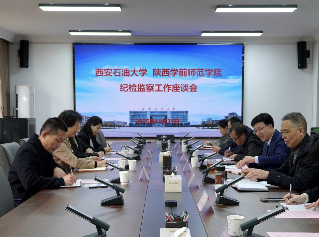 趙瓊對(duì)我校的熱情接待表示感謝,并對(duì)陜西學(xué)前師范學(xué)院的基本情況和紀(jì)檢監(jiān)察工作有關(guān)情況作了簡(jiǎn)要介紹。她表示,西安石油大學(xué)紀(jì)檢監(jiān)察工作成效顯著、富有特色。希望兩校紀(jì)檢監(jiān)察機(jī)構(gòu)進(jìn)一步加強(qiáng)溝通協(xié)作、拓寬視野、創(chuàng)新思路,不斷提升紀(jì)檢監(jiān)察工作質(zhì)效。