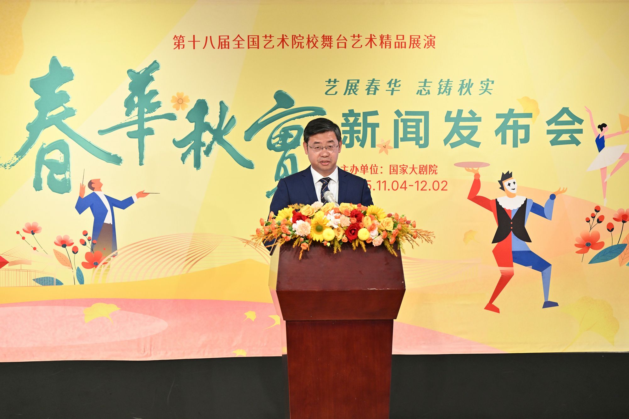 11月4日,國家大劇院第十八屆“春華秋實(shí)”全國藝術(shù)院校舞臺(tái)藝術(shù)精品展演新聞發(fā)布會(huì)成功舉行。國家大劇院黨組書記、院長王寧,教育部體育衛(wèi)生與藝術(shù)教育司副司長楊大研,文化和旅游部科技教育司副司長劉冬妍,中國科協(xié)宣傳文化部副部長李芳等領(lǐng)導(dǎo)出席,中央戲劇學(xué)院、上海戲劇學(xué)院、西安石油大學(xué)等參演院校負(fù)責(zé)人共同參加,新聞發(fā)布會(huì)由國家大劇院黨組成員、副院長王斑主持。校長王進(jìn)富作為非藝術(shù)類院校代表受邀出席并作主旨發(fā)言。