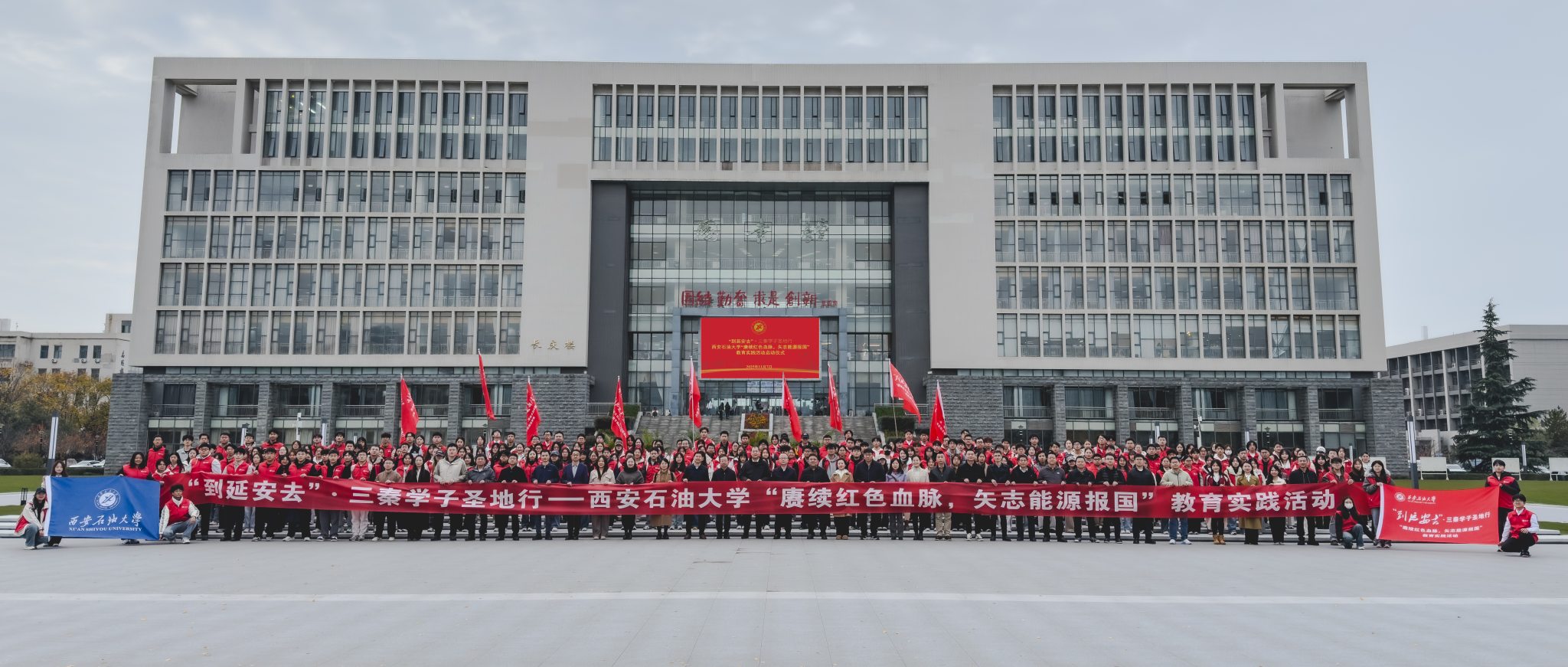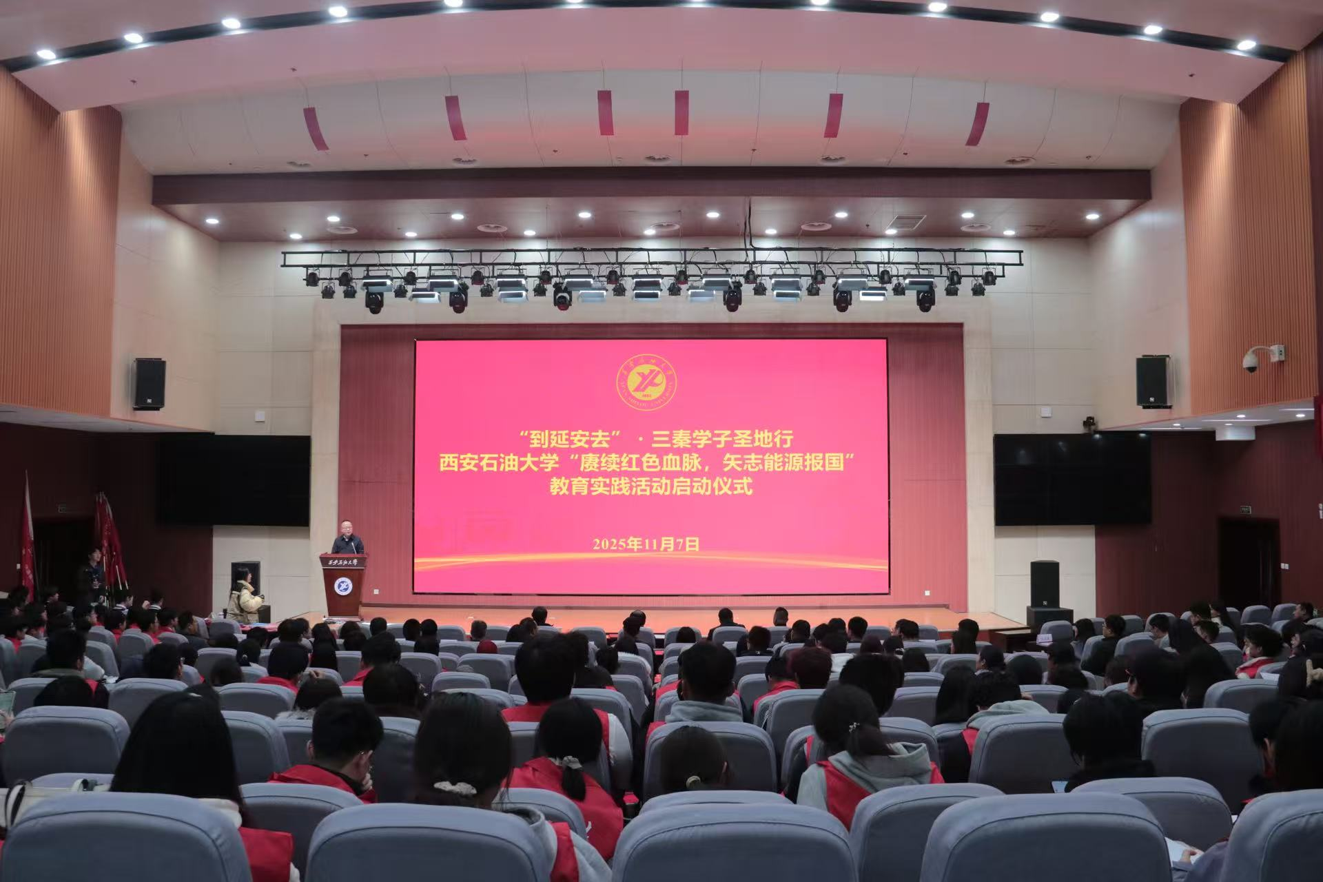 為深入貫徹習(xí)近平總書記關(guān)于“延安精神是黨的寶貴精神財富,要代代傳承下去”的重要指示精神,用好延安革命圣地豐富的紅色資源,充分發(fā)揮育人作用,根據(jù)陜西省委教育工委《關(guān)于組織開展“到延安去”·三秦學(xué)子圣地行活動的通知》要求,推動紅色文化資源深度融入“大思政課”建設(shè)和立德樹人全過程,11月7日下午,學(xué)校在鄠邑校區(qū)弘石學(xué)術(shù)報告廳舉行“到延安去”?三秦學(xué)子圣地行—西安石油大學(xué)“賡續(xù)紅色血脈,矢志能源報國”教育實踐活動啟動儀式。副校長種宇宏出席儀式并講話,黨委組織部、黨委學(xué)生工作部、校團委、馬克思主義學(xué)院、繼續(xù)教育學(xué)院等單位負(fù)責(zé)人,各院(系)學(xué)生工作負(fù)責(zé)人,團委(團總支)書記,學(xué)生黨支部書記及預(yù)備黨員代表,第十八期校級青年馬克思主義者干部培訓(xùn)班優(yōu)秀學(xué)員代表,團學(xué)骨干代表,2025級班級團支部書記代表400余人參加儀式。