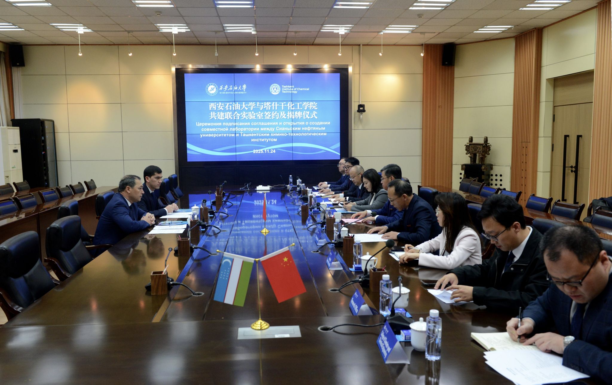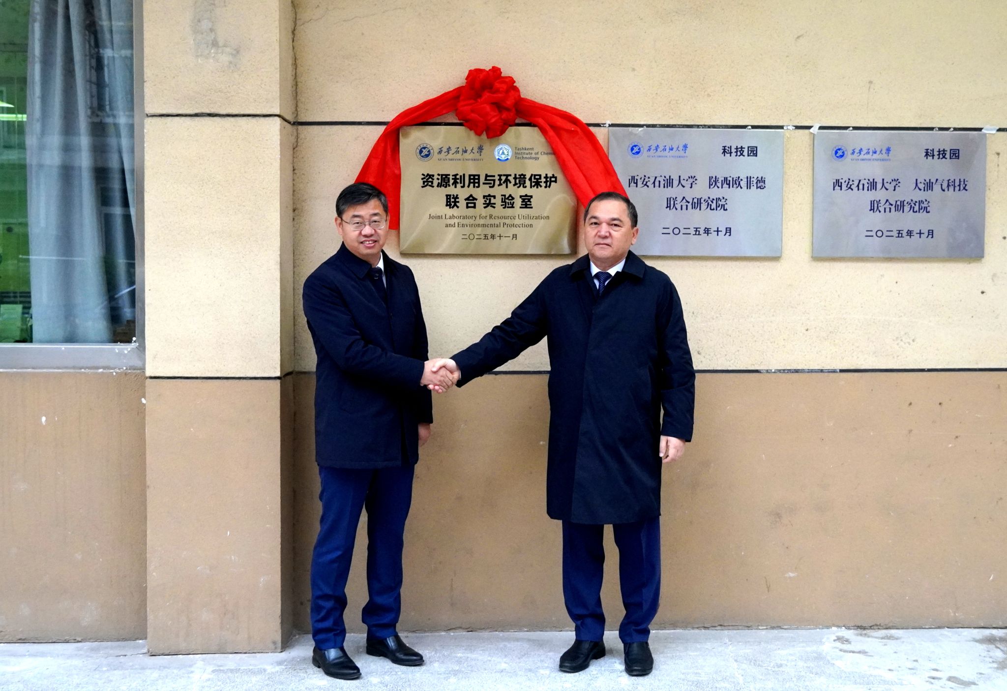 會上,兩校校長共同簽署《西安石油大學(xué)與塔什干化工學(xué)院共建資源利用與環(huán)境保護(hù)聯(lián)合實(shí)驗(yàn)室協(xié)議》,并現(xiàn)場為“資源利用與環(huán)境保護(hù)聯(lián)合實(shí)驗(yàn)室”揭牌。