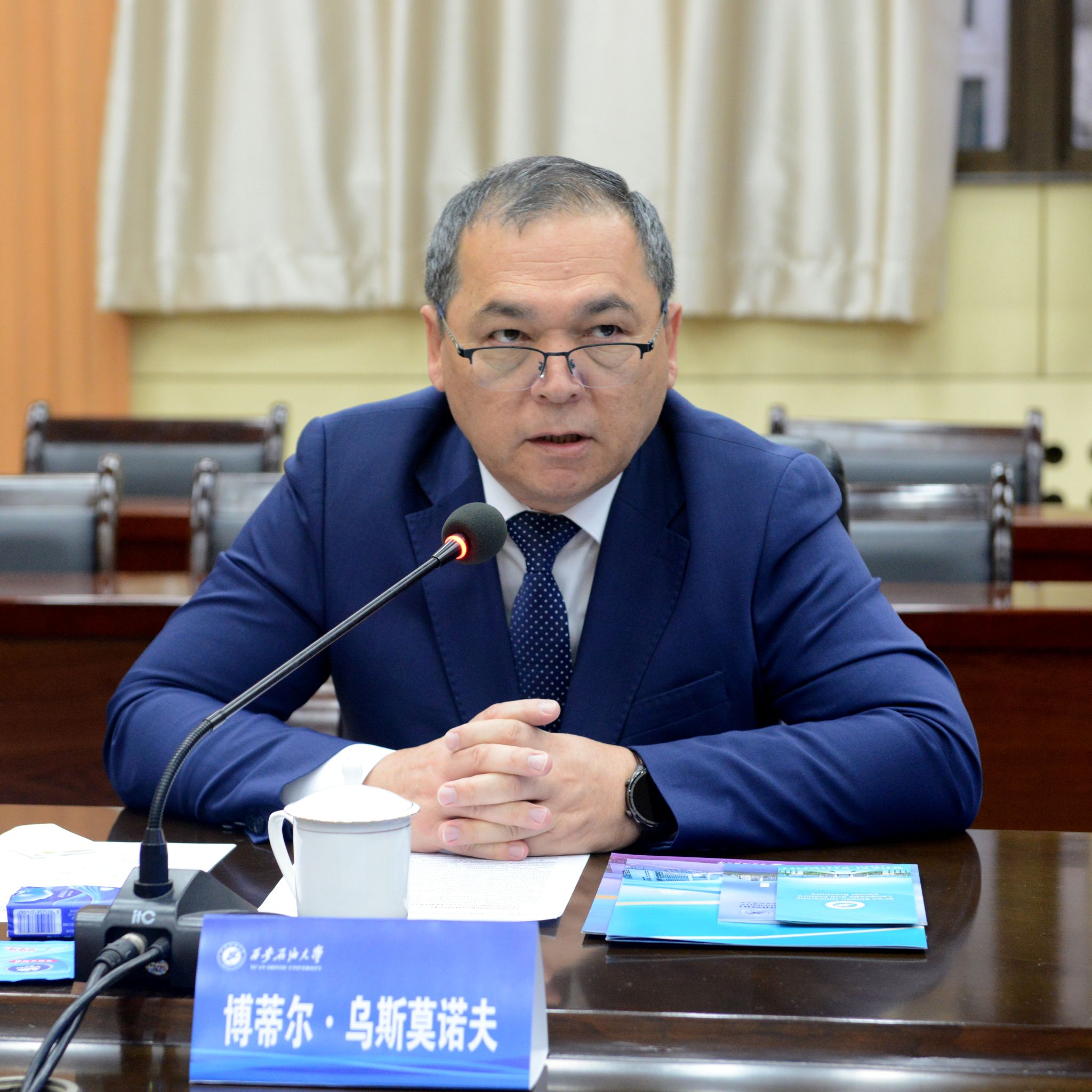 王進(jìn)富首先對博蒂爾·烏斯莫諾夫一行來訪表示熱烈歡迎,并簡要介紹了學(xué)校學(xué)科特色及當(dāng)前中亞國際合作辦學(xué)情況。他表示,兩校學(xué)科優(yōu)勢與戰(zhàn)略愿景高度契合,未來可在能源化工、資源利用與環(huán)境保護(hù)等方向?qū)崿F(xiàn)深度合作。愿雙方共建聯(lián)合實(shí)驗(yàn)室成為中烏教育合作的新亮點(diǎn),為雙方科研創(chuàng)新與人才培養(yǎng)提供更好平臺。
