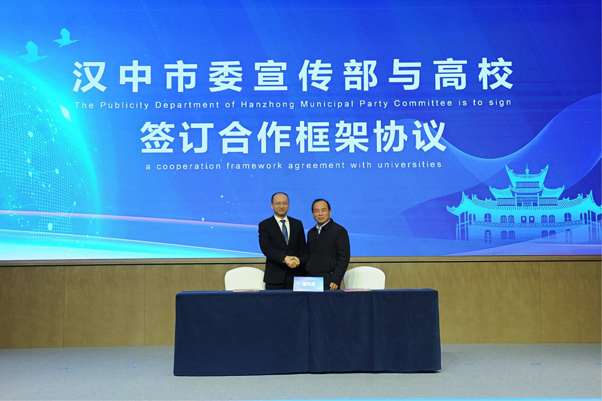 校黨委委員、宣傳部部長趙承勝代表學校與漢中市委宣傳部副部長、市融媒體中心主任孫國強現(xiàn)場簽約。