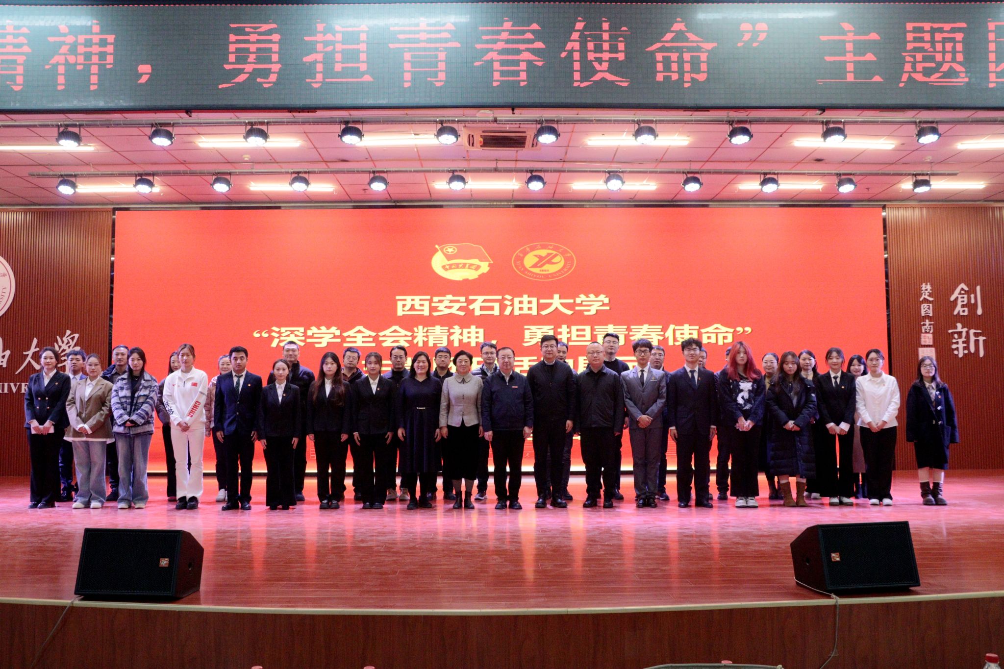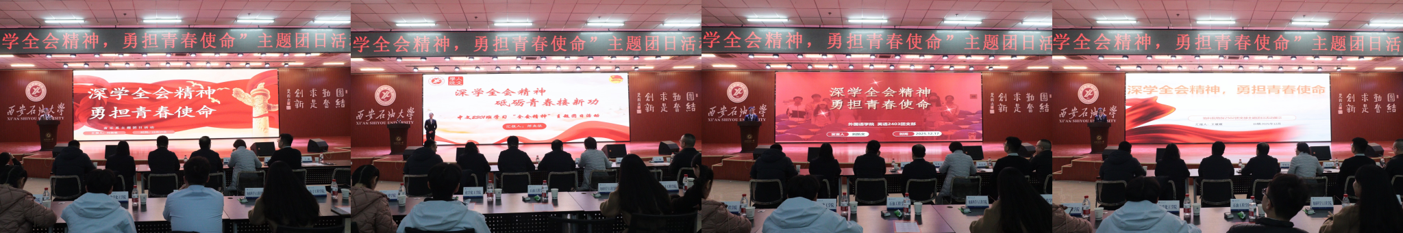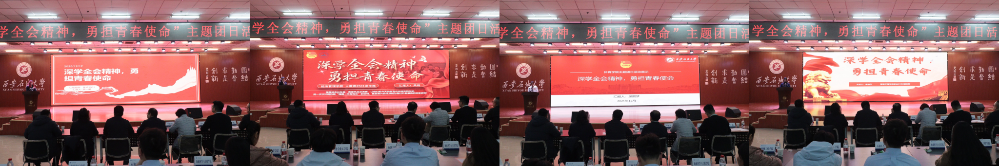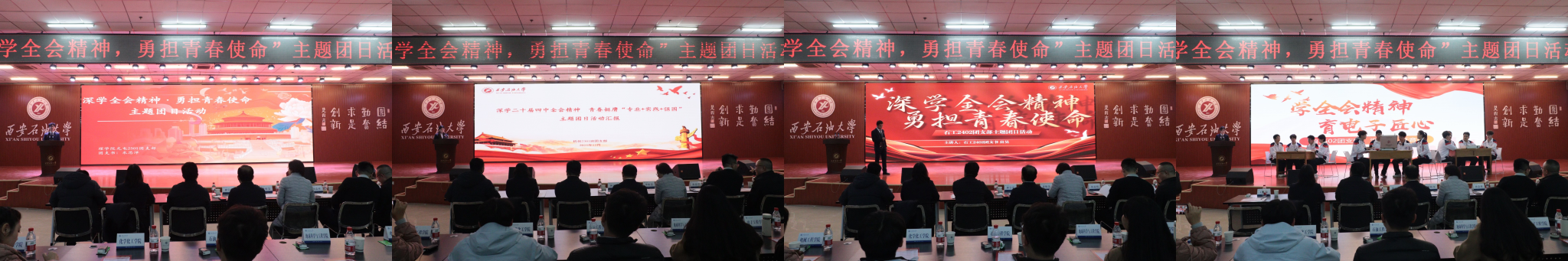 為引導(dǎo)團(tuán)員青年深刻領(lǐng)會黨的二十屆四中全會精神核心要義,集中展示我?;鶎訄F(tuán)組織風(fēng)采和主題團(tuán)日活動實(shí)效,發(fā)揮先進(jìn)典型的示范引領(lǐng)作用,進(jìn)一步激發(fā)全校團(tuán)員青年的愛國熱情與奮斗精神,12月17日晚,學(xué)校在鄠邑校區(qū)騰輝大學(xué)生活動中心舉辦“深學(xué)全會精神,勇?lián)啻菏姑敝黝}團(tuán)日活動展示,副校長種宇宏出席,相關(guān)職能處室負(fù)責(zé)人擔(dān)任評委,各院(系)團(tuán)委(團(tuán)總支)書記及300余名學(xué)生代表參加活動。