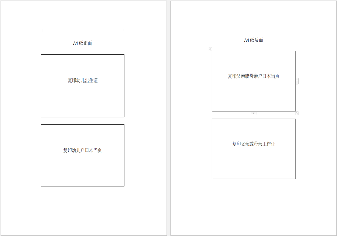 辦理入園手續(xù)時(shí),家長需攜幼兒出生證明原件及復(fù)印件、幼兒戶口本當(dāng)頁復(fù)印件、父親或母親戶口本當(dāng)頁復(fù)印件、父親或母親本人工作證復(fù)印件(以上資料請(qǐng)?zhí)崆笆褂肁4紙依次進(jìn)行雙面復(fù)印,復(fù)印模板附后)。
