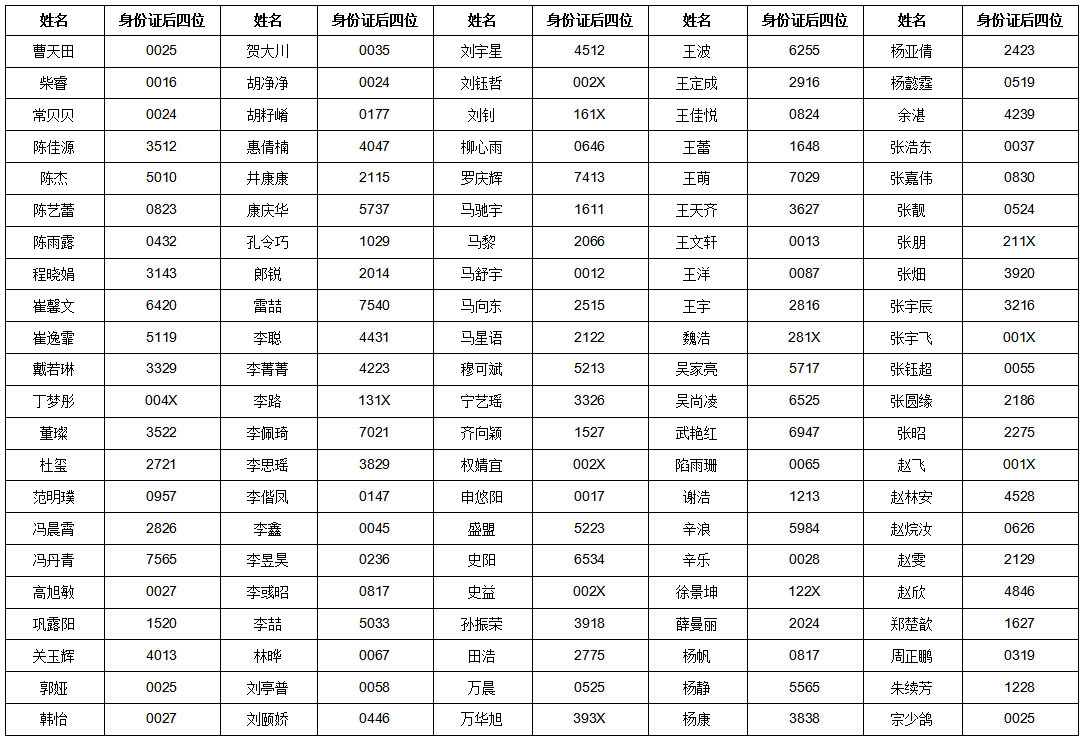 經(jīng)學(xué)校人事代理人員招聘統(tǒng)一筆試,以下人員進(jìn)入專業(yè)技能測試考核環(huán)節(jié),現(xiàn)將人員名單及身份證號后四位公示如下(按姓氏拼音排序):