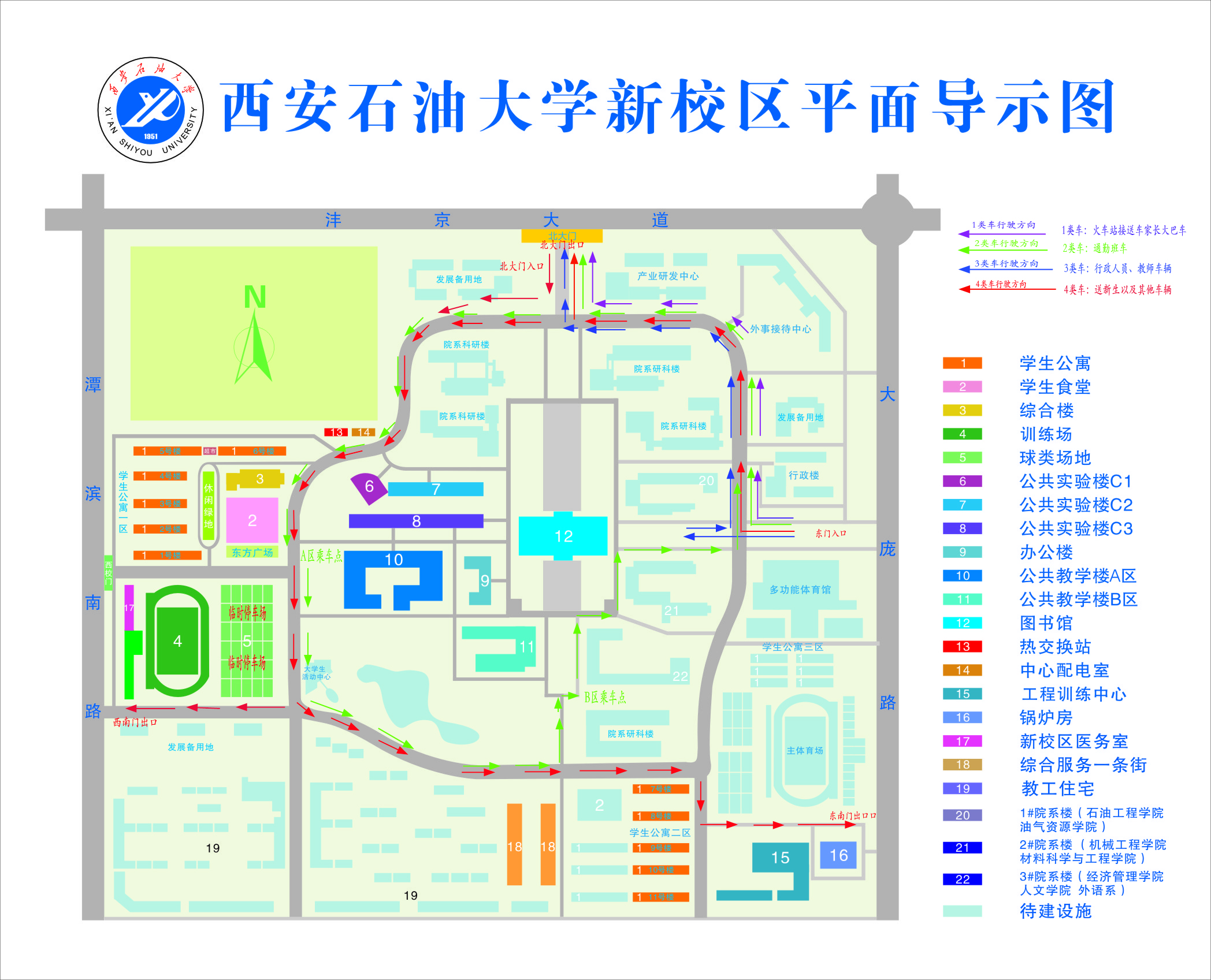 1、車站接送新生及家長(zhǎng)的大巴車:由東大門進(jìn)入后右拐(向北)至主環(huán)道口短暫停放,經(jīng)環(huán)道由北門駛出。
