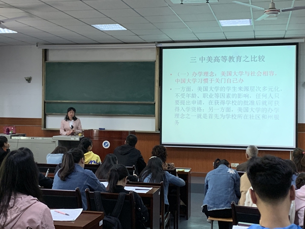 朱海娟副教授,畢業(yè)于西北農(nóng)林科技大學(xué)獲博士學(xué)位,西北大學(xué)博士后,美國(guó)路易斯安那大學(xué)拉法葉分校訪問(wèn)學(xué)者,報(bào)告的題目為《中美高等教育比較研究》。報(bào)告主要內(nèi)容對(duì)比了中美高等教育在辦學(xué)理念、教育目標(biāo)、教學(xué)組織方式的差異,并通過(guò)學(xué)術(shù)誠(chéng)實(shí)教育、教學(xué)設(shè)施配置、畢業(yè)典禮等細(xì)節(jié),指出了美國(guó)高等教育中普遍存在的開(kāi)放、以人為本、注重綜合素質(zhì)培養(yǎng)、教學(xué)方式靈活等特征。