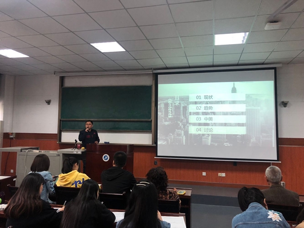 陳丁博士,畢業(yè)于西安交通大學(xué)獲博士學(xué)位,美國(guó)堪薩斯大學(xué)訪問(wèn)學(xué)者,報(bào)告題目為《多棱鏡下的美國(guó)》。報(bào)告主要內(nèi)容從社會(huì)、教育、民生、環(huán)境等多個(gè)角度,展示、分析當(dāng)今美國(guó)的發(fā)展現(xiàn)狀;通過(guò)對(duì)比美國(guó)十年間的變化,探討了未來(lái)美國(guó)的可能發(fā)展走勢(shì);并對(duì)中美間未來(lái)的關(guān)系特征提出自己的判斷,并對(duì)計(jì)劃前往美國(guó)學(xué)習(xí)、訪問(wèn)、工作的聽(tīng)眾,提供了個(gè)人建議。