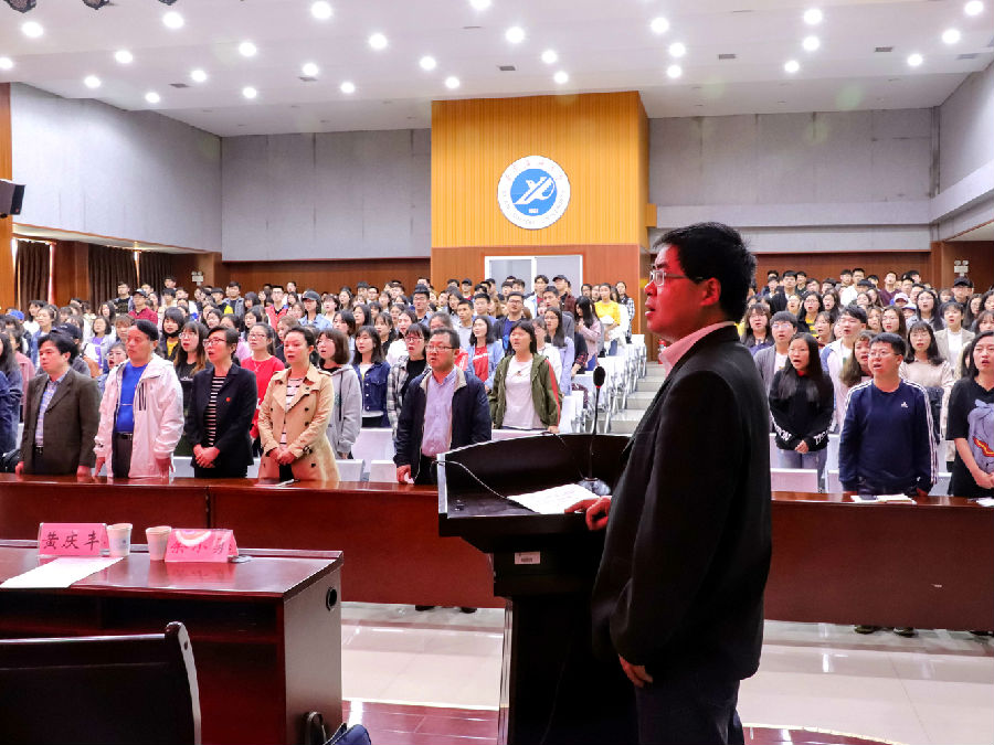 最后,伴隨著熟悉的旋律,在場人員全體起立,合唱由陳忠實先生作詞的校歌《輝煌明天》。正如歌詞中所唱:“青春無愧,指點江山,看我同學少年”。先生雖去,精神永存,石油學子定當不負先生所望,成就一片輝煌明天。