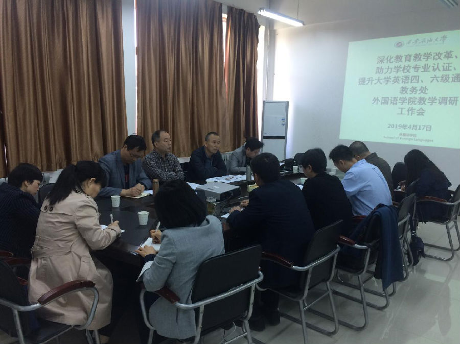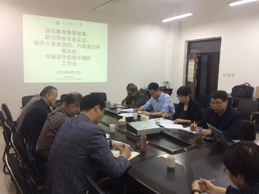 外國語學院大學英語教學部主任、課程組負責人及教師代表紛紛圍繞深化大學英語教學改革,提升大學英語四、六級通過率,配合學校專業(yè)認證等方面問題積極發(fā)言,獻言獻策,并與調(diào)研領導進行了深入的探討和交流。