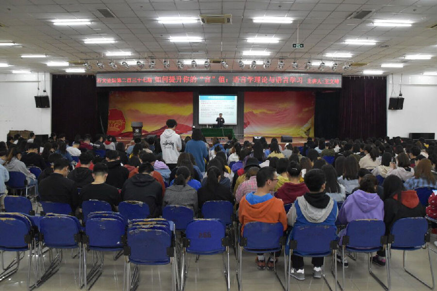 3月26日晚,由校團(tuán)委主辦、外國(guó)語(yǔ)學(xué)院團(tuán)委學(xué)生會(huì)承辦的石大青年論壇第237期“如何提升你的‘言’值:語(yǔ)言學(xué)理論與語(yǔ)言學(xué)習(xí)”在鄠邑校區(qū)騰輝大學(xué)生活動(dòng)中心舉行,本期論壇邀請(qǐng)了我院青年教師王文峰博士擔(dān)任主講,我院全體學(xué)生以及學(xué)校其他院系學(xué)生參加了此次講座。