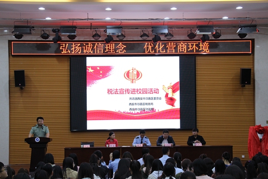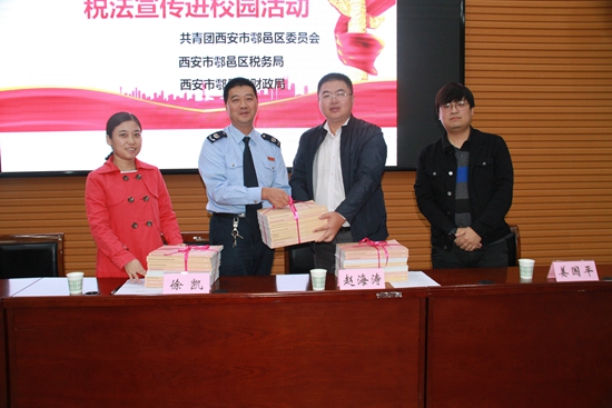 區(qū)稅務(wù)局總經(jīng)濟師徐凱介紹由西安市團委、稅務(wù)局、財政局聯(lián)合發(fā)起的稅收宣傳進校園的活動概括,并宣傳從早抓起,在學(xué)生中倡導(dǎo)懂法、知法、守法、學(xué)法,鼓勵學(xué)生爭做稅收宣傳員。