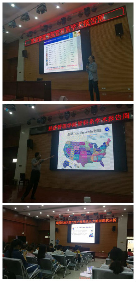 第一場講座是由國家一級注冊建造師尹志國老師介紹了“BIM技術(shù)的發(fā)展現(xiàn)狀及應(yīng)用”;第二場講座是由電子商務(wù)專業(yè)帶頭人王小寧教授解讀了“石油行業(yè)中電子商務(wù)的應(yīng)用情況”;第三場講座是由李俊亭副教授講述了他在美期間的“訪學(xué)見聞”;第四場講座是由管科系主任杜小武副教授做了題為“我國石油天然氣生產(chǎn)格局及幾大油田現(xiàn)狀分析”的石油科普教育。
