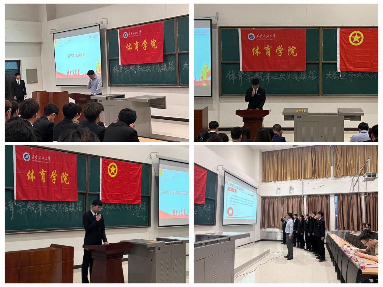 體育學院團委書記姜國平宣讀了校團委《關于同意召開共青團西安石油大學體育學院第三屆委員會屆內調整暨第六次學生代表大會的批復》。隨后,大會聽取和審議了籌備工作組組長魯佳鑫作的《體育學院第三屆團委委員會屆內調整暨第六次學生代表大會籌備工作報告》和第五屆學生會輪值主席劉思宇作的《體育學院第五屆學生會工作報告》。按照大會議程和選舉辦法,經(jīng)民主投票分別選舉產生了體育學院新一屆團委委員和學生會委員會委員,全體新當選委員在姜國平老師的帶領下面向團旗進行了莊嚴宣誓。