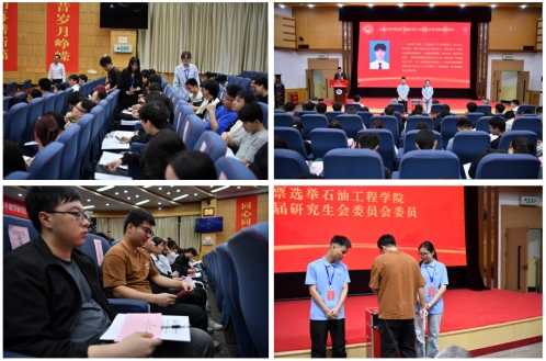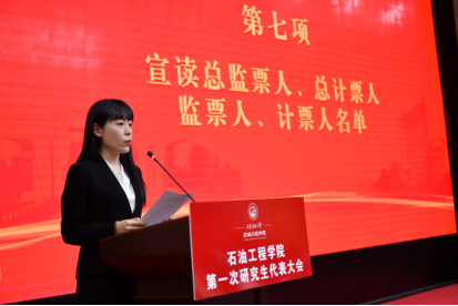 石油工程學院黨委組織員宋興淼向大會作籌備工作報告;學生工作辦公室主任史陽宣讀第一次研究生代表大會選舉辦法;博士研究生輔導員余靚豪宣讀總監(jiān)票人、總計票人、監(jiān)票人、計票人名單。