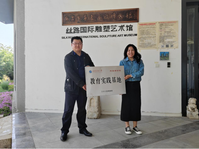 張建高、邱嶺與絲路國(guó)際雕塑文化藝術(shù)園負(fù)責(zé)人熱切交流。在交流中,雙方就合作的方向、內(nèi)容以及未來(lái)的發(fā)展規(guī)劃等進(jìn)行了深入探討,在大家的共同見(jiàn)證下,外國(guó)語(yǔ)學(xué)院在絲路國(guó)際雕塑文化藝術(shù)園教育實(shí)踐基地正式掛牌。