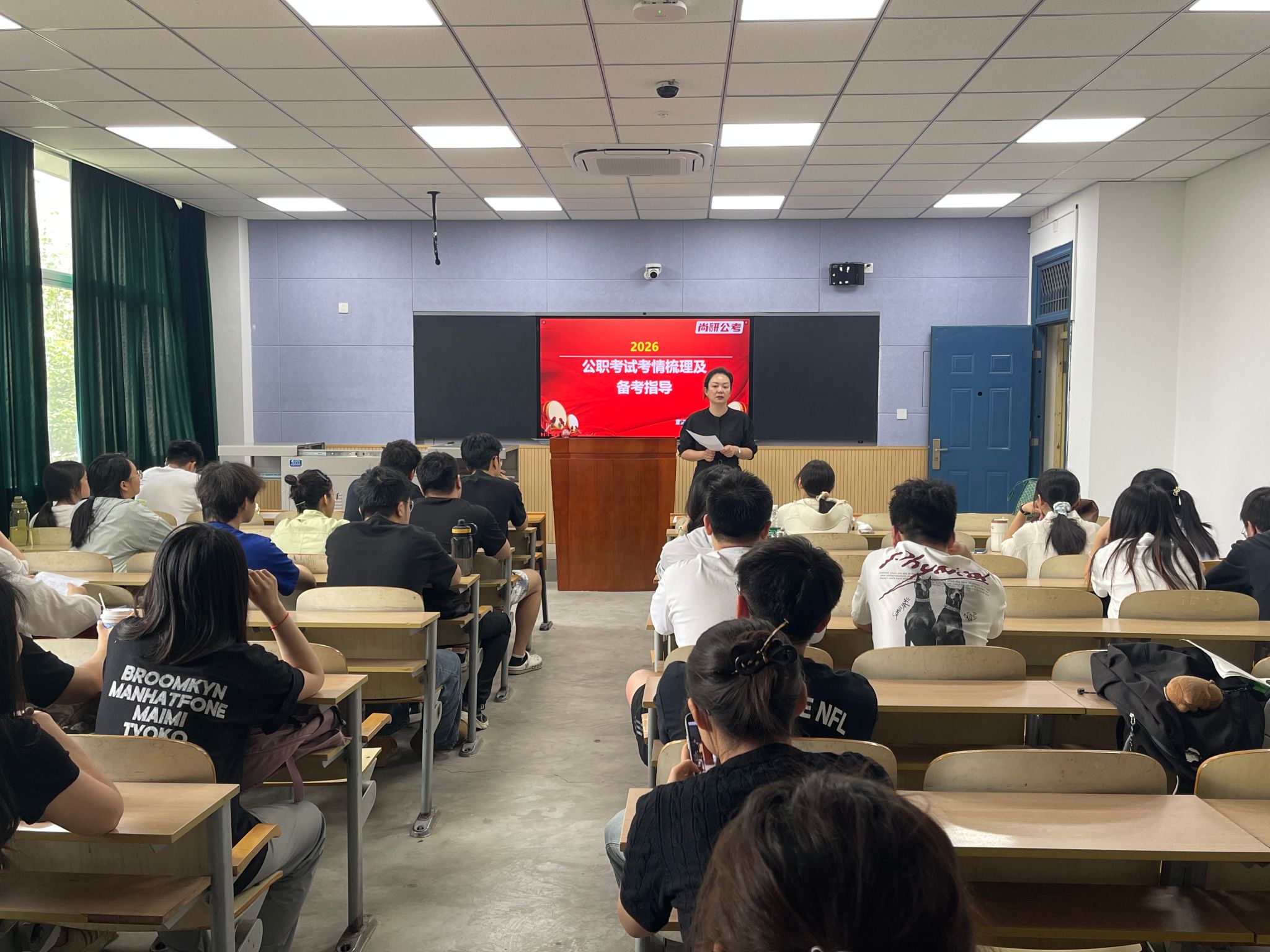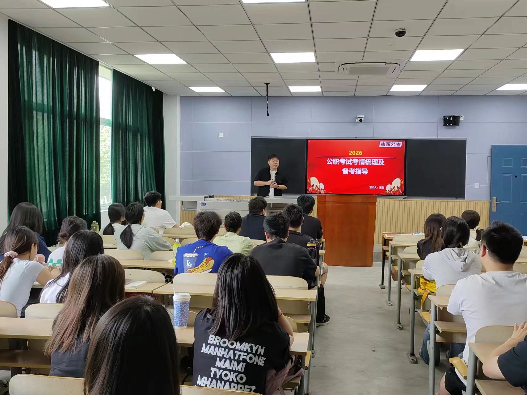 為助力2026屆畢業(yè)生科學(xué)備戰(zhàn)公務(wù)員考試,精準(zhǔn)把握考情趨勢,提升應(yīng)試能力。5月7日下午,人文學(xué)院在博覽樓A105舉辦“2026年公職考試考情梳理及備考指導(dǎo)”專題講座。本次活動(dòng)由人文學(xué)院聯(lián)合尚研公考共同發(fā)起,人文學(xué)院黨委副書記盛丹、尚研公考名師王蘅、2021級輔導(dǎo)員張馨元出席活動(dòng),人文學(xué)院與經(jīng)管學(xué)院意向考公學(xué)生到場參與。