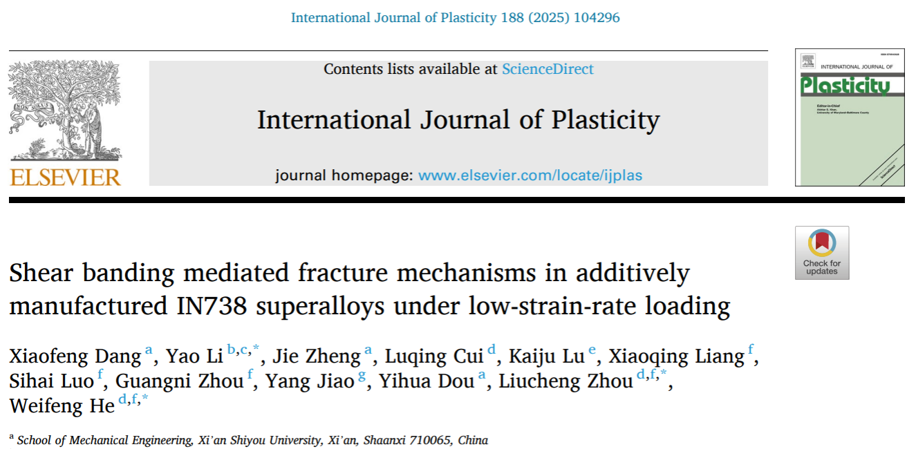 近日,我校機械工程學(xué)院青年教師黨曉鳳為第一作者、西安石油大學(xué)為第一單位,在塑性力學(xué)領(lǐng)域國際頂級期刊《International Journal of Plasticity》(中科院一區(qū)TOP期刊,IF=9.4)上發(fā)表了題為《Shear banding mediated fracture mechanisms in additively manufactured IN738 superalloys under low-strain-rate loading》的最新研究成果。合作者包括我校鄭杰副教授和竇益華教授。