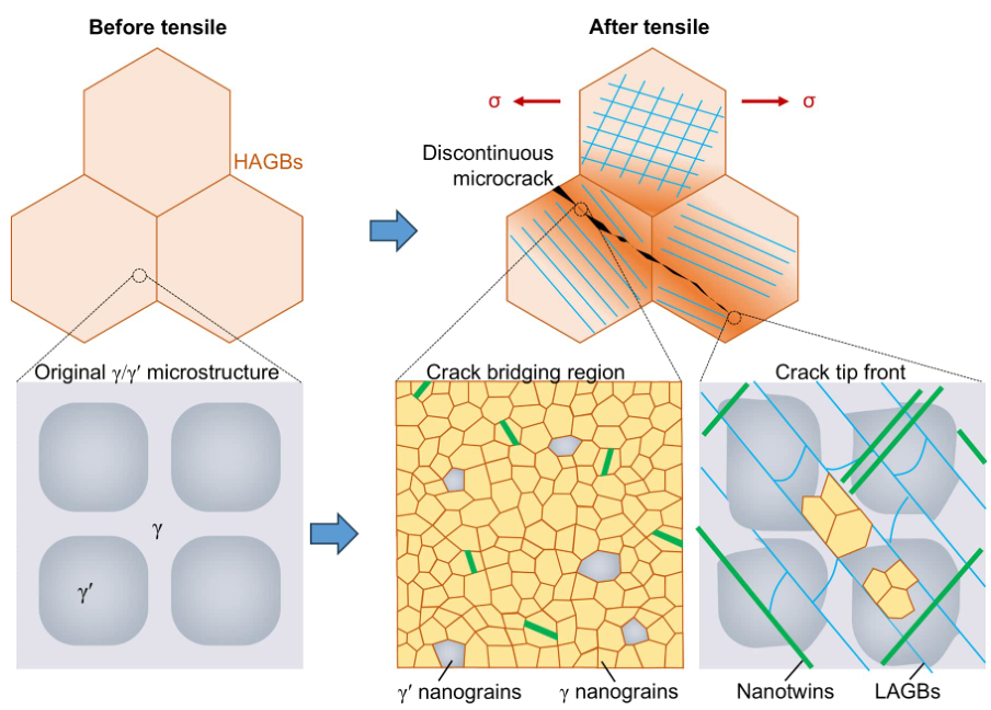 本研究首次揭示了EBPBF制備IN738高溫合金在低應(yīng)變率(1×10?3 s?1)拉伸載荷下剪切帶介導(dǎo)的斷裂新機制。通過優(yōu)化電子束掃描策略與熱場控制,成功制備出缺陷率低、柱狀晶<001>織構(gòu)顯著的致密高溫合金,其性能優(yōu)于鑄造IN738合金。研究發(fā)現(xiàn),EBPBF工藝制備的高溫合金中納米碳化物均勻分布,有效抑制裂紋萌生,并通過剪切帶作用實現(xiàn)穿晶斷裂。裂紋擴展路徑中形成的剪切帶伴隨γ'強化相納米化與動態(tài)再結(jié)晶現(xiàn)象,通過位錯滑移與孿生協(xié)同作用耗散裂紋能量,顯著提升了合金的裂紋擴展阻力。該研究為高性能高溫合金的可靠性設(shè)計提供了理論支撐。