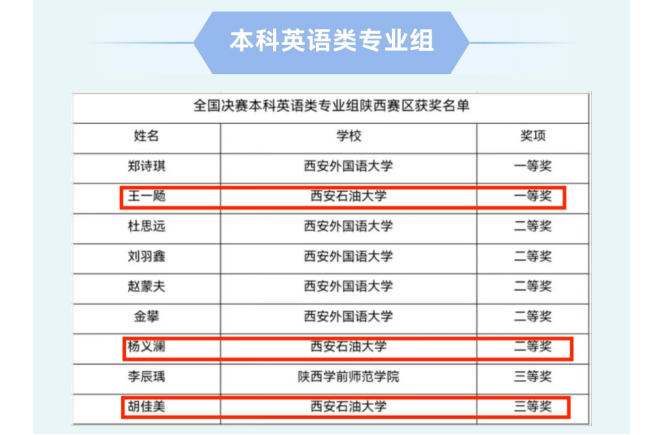 本屆大賽我校學生分別參加了本科非英語專業(yè)組、本科英語類專業(yè)組兩個組別的比賽,共有2518名同學報名參加。校賽結(jié)束后共有169名同學進入省賽,經(jīng)過激烈角逐,我校共獲得省賽特等獎1人,一等獎5人,二等獎16人,三等獎20人。最終王思思、劉鈺歆、李子達3位同學獲得本科非英語類專業(yè)組省賽一等獎并晉級國賽;王一飏、楊義瀾、胡佳美3位同學分別獲得本科英語類專業(yè)組省賽特等獎和一等獎并晉級國賽。