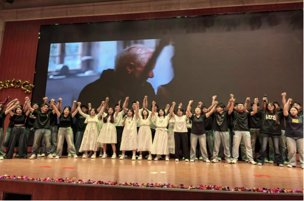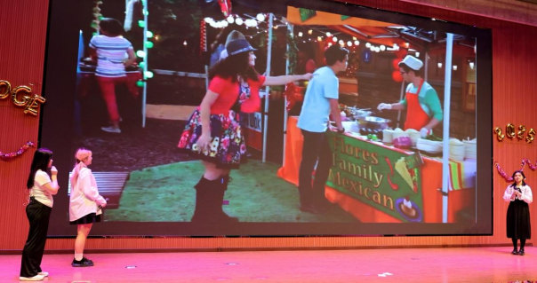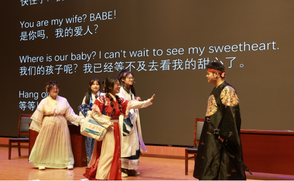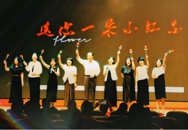 本次匯報演出共24個節(jié)目,分別由《英語電影賞析》《英語歌曲與英語文化》《中國文化推介》《跨文化交際視聽說》《英漢翻譯技巧與實踐》和《實用英語寫作》6門大學英語拓展課程的同學及教師參演。節(jié)目異彩紛呈,涵蓋了電影配音、拓展課程介紹、歌曲演唱、英語話劇、跨文化情景劇短視頻、舞蹈、相聲等多種形式。在本次課程匯演的舞臺上,外國語學院第一教學部拓展課程組教師溫情獻唱,致敬成長,傾情演繹歌曲《送你一朵小紅花》。他們從講臺走向舞臺,用溫暖而真摯的歌聲傳遞著對莘莘學子的關(guān)愛與期許。這首飽含鼓勵與祝福的旋律,在師生心中播撒下溫暖與力量,成為匯演中一抹動人的亮色,生動詮釋了和諧融洽、積極向上的校園文化氛圍與教育溫度。