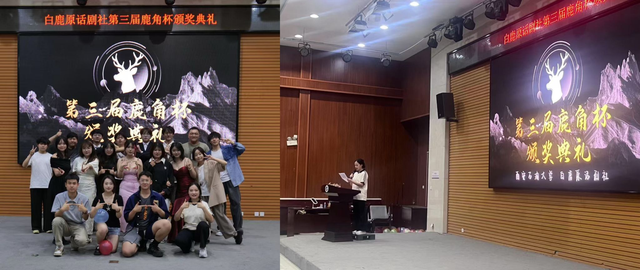 5月25日,白鹿原話劇社在崇文樓就業(yè)指導(dǎo)中心多功能廳舉辦第三屆白鹿原話劇社鹿角杯頒獎(jiǎng)典禮。表彰社團(tuán)干部為社團(tuán)發(fā)展做出的貢獻(xiàn),推動(dòng)社團(tuán)向前發(fā)展,通過(guò)表演新話劇展現(xiàn)話劇魅力,邀請(qǐng)同學(xué)進(jìn)行才藝展示互動(dòng),共同感受話劇藝術(shù),現(xiàn)場(chǎng)氣氛熱烈,受到師生一致好評(píng)。
